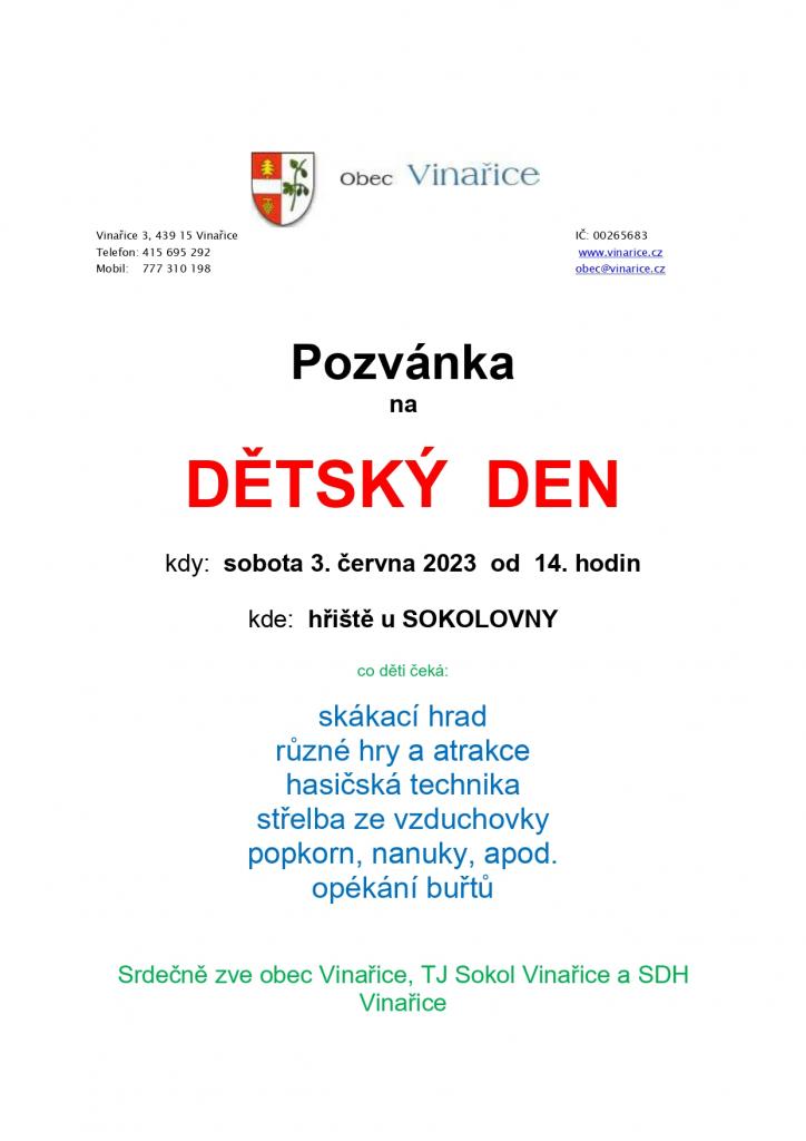 Zveme vás na Dětský den u nás ve Vinařicích.